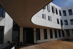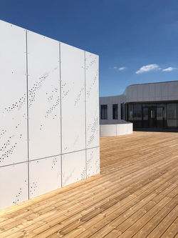 Bâtiment à haute performance énergétique. Structure poteau-poutre plancher en béton et façades en ossature bois.