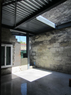 Réhabilitation et surélévation d'une petite maison existante en plain pied, la nouvelle extension est posée sur des micropieux et pilotis verticalement désolidarisée de la maison existante. Seul le contreventement est organisé comme un ensemble existant+extension. Structure métallique et murs a ossature bois en remplissage.